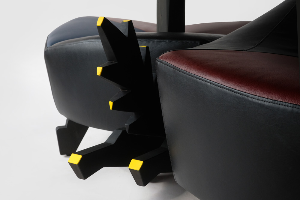 空也上人さんが可愛がっていた鹿を殺されてしまって、その供養に皮をなめして着ていた逸話から、ジビエの鹿革で張っています。元の像が前かがみなのとこのモチーフの椅子にふんぞり返って座ることはないと思ったので背は通常の椅子とは反対に傾斜させています。