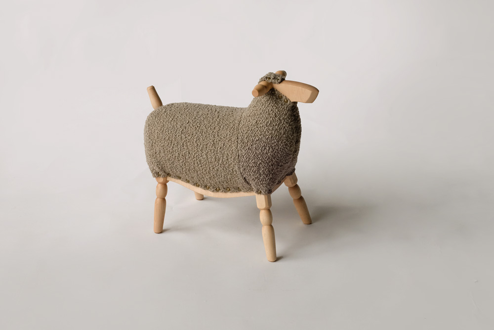 全体のサイズが小さくなって脚が細くなる分、強度のある木材を使用しています。そのような硬い木材は、スピンドル加工するととても美しくなります。そのスピンドルの脚、耳と角の中間のような形の持ち手、親を見上げる姿勢、顔のパーツにいれた斑がポイントです。