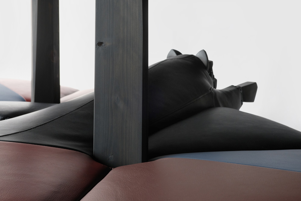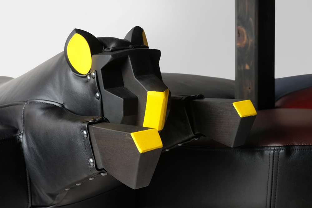 木材(ナラ)、ジビエ猪革、ウレタンフォーム、綿、鋲、鉄媒染液(黒)、家具用オイル塗料