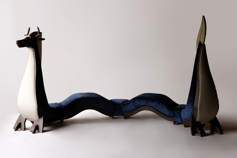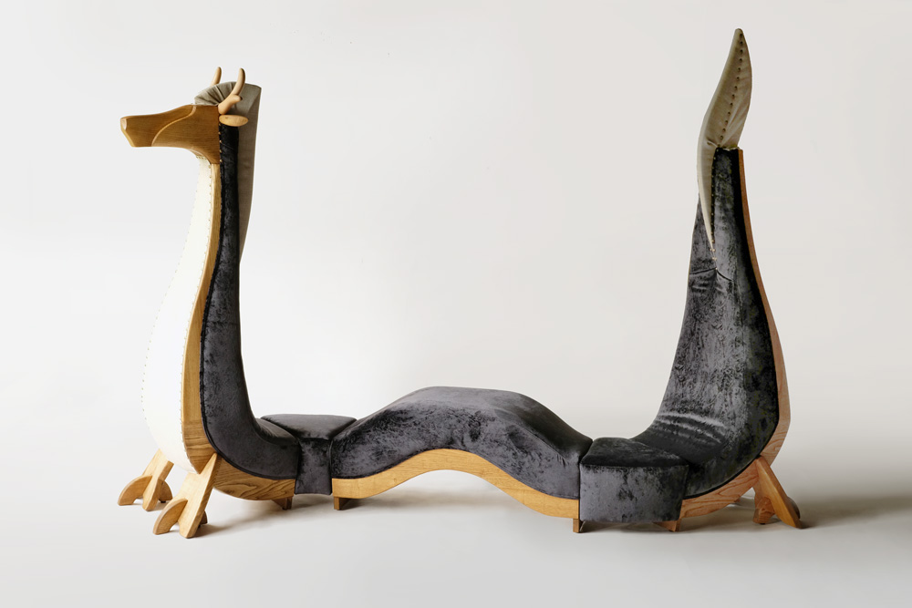 7つのパーツをベッド用の金具でジョイントしています。箱型の椅子は立ち上がりが90度だと足元コツコツして嫌なので内側に絞って、そのぶん安定悪くなるのを重くして解消するのも嫌で、蛇行させました。
